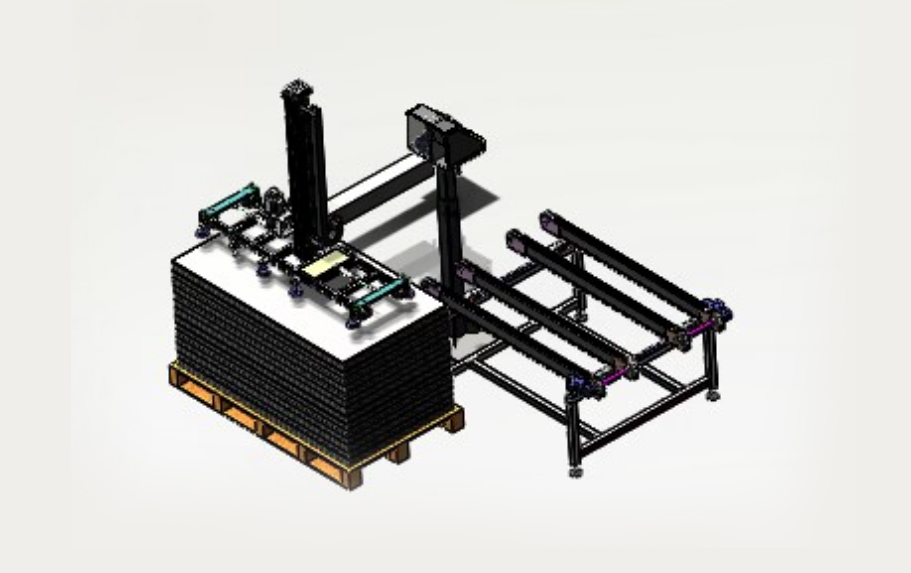 自動(dòng)排版機(jī)的主要功能單元有:玻璃輸送定位系統(tǒng)、抓取行走系統(tǒng)、視覺檢測(cè)系統(tǒng)、電控系統(tǒng)等;通過以上功能單元,實(shí)現(xiàn)了將自動(dòng)串焊機(jī)串焊好的電池串,按照工藝尺寸要求和排版方向順序自動(dòng)排版鋪設(shè)到玻璃(EVA已經(jīng)鋪設(shè))上,組成電池串陣列。玻璃/EVA通過傳輸線傳輸至指定位置,機(jī)械手抓取電池串實(shí)現(xiàn)CCD定位、自動(dòng)旋轉(zhuǎn)、自動(dòng)排版功能。設(shè)備通過同步帶傳輸與自動(dòng)生產(chǎn)線對(duì)接,實(shí)現(xiàn)了自動(dòng)流水作業(yè)。